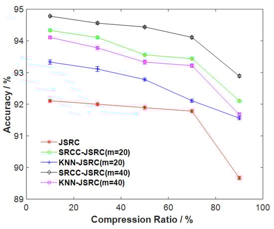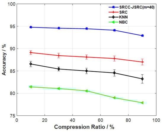 Next, we evaluate the classification performance of our proposed method based on the different compression ratios to examine the feasibility of the energy-efficient telemonitoring of gait. The number of neighboring samples are selected as 20 and 40, respectively. The comparative results from all JSRC-based models are shown in Figure 2. The errors of accuracy based on the different compression ratios are also presented in Figure 2. Table 3 shows the mean and SD values of the best accuracy from all selected algorithms. As shown in Figure 2 and Table 3, the SD of all accuracies can obtain lower error. From Figure 2, we obviously see that, based on the different compression ratios, our proposed method (SRCC-JSRC) can produce better accuracy than KNN-JSRC and JSRC, suggesting that the neighboring samples by our defined criteria contain the more valuable information about the test sample. In particular, when the compression ratio increases from 10 to 70%, SRCC-JSRC () reaches the best accuracy. These results showed that our proposed method can yield the superior classification performance when the compression ratio is properly selected. That is, our proposed method can potentially produce the best classification performance as well as the best energy efficiency of sensors. In addition, from Figure 2, we also find that all JSRC-based gait classifications produce poor accuracy when the compression ratio is more than 70%. This suggests that the higher compression ratios could lose the more valuable correlation information regarding gait.