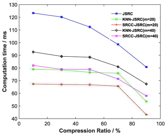 Meanwhile, we also evaluate the computational time cost of all JSRC-based models based on the different compression ratios. Here, statistical analyses to determine the mean and standard deviation (SD) are performed for the obtained computational time from the different classification algorithms. All comparative results are shown in Figure 4. The errors of the obtained computational time based on the different compression ratios are also presented in Figure 4. Table 4 shows the mean and SD values of the lowest computation time from all selected algorithms. As shown in Figure 4 and Table 4, the SD of all computation times can obtain lower error. From Figure 4, we can obviously see that the computation time cost of each JSRC-based model is reduced as the compression ratio increases. In comparison, our proposed method (SRCC-JSRC) has the lowest computational time cost. In particular, the lowest computational time cost of SRCC-JSRC () remains only 67 ms while the compression ratio increases from 10 to 70%. These results demonstrate that our proposed method could possibly result in a lower computational time cost and better energy efficiency of sensors when the compression ratio is properly selected. Besides this, we also observe that, once the compression ratios are more than 70, all computation times significantly decline. This is because the higher compression ratios could yield fewer multi-sensor gait data to be processed.