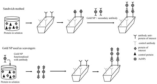 Comparative representation of the application of gold NPs in the sandwich method, where the proteins in solution are directly injected on the biosensor, and the application of gold NPs as protein scavengers, where the NPs are firstly mixed with the proteins in solution and then injected on the biosensor.
