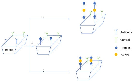 Representation of the SPR assays: Firstly, the biosensor was functionalized with antibody anti-ConA and anti-PNA. Following, (A) protein captured by AuNPs functionalized with antibody anti-ConA or anti-PNA, (B) protein in solution or (C) protein covalently linked to AuNPs was injected on the biosensor.