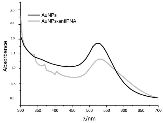 UV-Vis spectrum of gold NPs before (AuNPs) and after the functionalization with antibody anti-PNA (AuNPs-antiPNA).