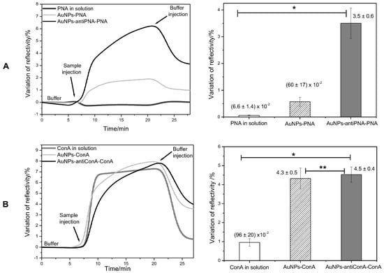 Kinetics curves and mean value of the variation of reflectivity on spots of antibody anti-PNA (A) and on spots of antibody anti-ConA (B) after the injection of proteins in solution (dark gray), proteins covalently linked to gold NPs (light gray) and proteins captured by gold NPs functionalized with antibody anti-PNA or anti-ConA (black) at the concentration of 94 nM. * Values significantly different (ANOVA; ). ** Values not significantly different (ANOVA; ).