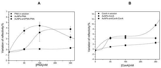 The comparison of the interaction with the specific antibody to the interaction with the antibody used as the negative control revealed that the lectins interacted preferably with their respective antibody when the proteins were in solution or conjugated with gold NPs. However, the variation of reflectivity on the spots of the antibodies used as a negative control was higher than the variation observed on BSA spots. The high similarity among the molecular structures of PNA and ConA makes their respective antibodies able to recognize both proteins, but with different affinity and extension. Nevertheless, the SPR signals observed on the spots of antibodies anti-PNA and anti-ConA after the injection of respective lectins were about 30–50% higher than the signals observed on the spots of the negative control (Figure 8).