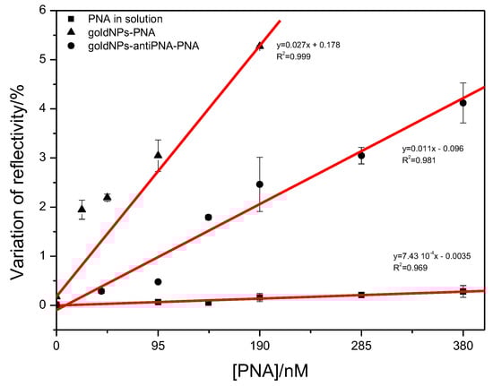 The limit of detection of each method was calculated after performing SPR assays with solutions of PNA, PNA covalently linked to gold NPs and PNA captured by gold NPs at the concentrations of 95 nM, 142.5 nM, 190 nM, 285 nM and 380 nM. The average value of variation of reflectivity and the standard deviation of each measurement were used to construct the analytical curve as a function of protein concentration. Linear fitting was applied at the linear range of the analytical curve, and the slope was used in Equation (1). The SPR assays were also performed with blank samples that were composed of solutions without protein or gold NP suspension incubated with solutions without protein. The standard deviation of the values of variation of reflectivity observed in those assays was used in Equation (1) in order to calculate LOD values for each method.