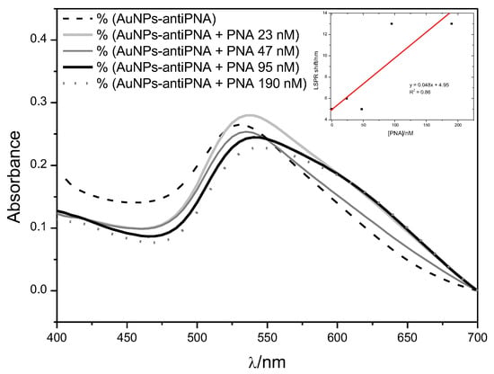 UV-Vis spectra of gold NPs functionalized with antibody anti-PNA after incubation with PNA solution at different concentrations. Insert: Linear fitting of LSPR shift of gold NPs functionalized with antibody anti-PNA as a function of the concentration of PNA in solution.