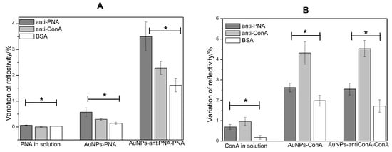 Mean values and standard deviation of the variation of reflectivity on spots of antibody anti-PNA (A) and antibody anti-ConA (B) after the injection of PNA (A) and ConA (B) at the concentration of 95 nM in solution, covalently linked to gold NPs and captured by gold NPs functionalized with anti-PNA or anti-ConA. * Values significantly different (ANOVA, ).