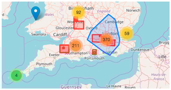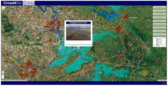 Thus, the incoming data are automatically ranked according to their relevance. An example for high-ranked information would be a tweet referencing an image with geolocation information in the determined area of the disaster, from a known source (e.g., official Civil Protection of the country). The geospatial information can be used by a geographic information system (GIS) to extract relevant information, e.g., add the georeferenced or geolocated (see Section 4.6) images to a GIS layer to visualise information about damaged buildings or flood marks. Figure 1 shows the distribution of geolocated Tweets containing images for the Southern England flood in 2014. The rectangles show the areas for which rapid maps were produced, while the polygon shows the area referring to number 370 in the map. Another example for high-ranked data are georeferenced videos from known sources that can be visually analysed.