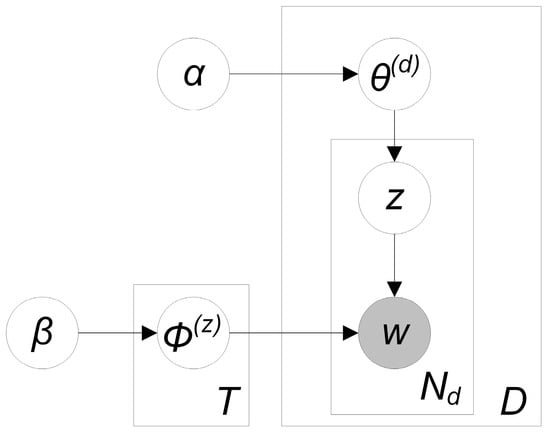 In the next step, the topic modelling algorithm LDA [] is applied to extract semantic topics from the pre-processed social media data. LDA requires a number of input parameters (see Figure 3). First, T represents the number of topics to be generated from the documents D (i.e., social media posts). Second, α influences the document-topic distribution. In fact, α increases the sparsity of the topic distribution when it is close to zero, whereas it smooths this distribution when assigned a larger value []. The parameter β represents the distribution over words in a topic, meaning that a topic contains more or fewer words depending on the value of β. Like α, β also smooths the distribution when assigned a higher value and the distribution becomes sparser when assigned a lower value. φ, θ and z are latent variables that are inferred during the process and w represents the observed words of the social media posts.