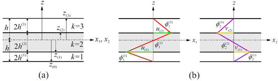 As described in Figure 2a, the superscript (k) used in Equation (3a,b) indicates the k-th lamina, whereas the subscript (k) defines the interface between the k-th and (k + 1)-th laminae. Moreover, as depicted in Figure 2b, the functions and denote through-the-thickness piecewise-linear zigzag functions that can be expressed as [42]: