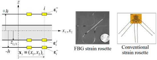As shown in Figure 3, three different conventional strain gauges and/or embedded FBG sensors can be stacked together to form a strain rosette for gathering onboard triaxial strain measurements. Based on the iFEM-RZT methodology, three different strain rosettes should be located along the thickness direction of each particular location , where ‘n’ indicates the total number of discrete sensor locations. For example, conventional strain rosettes can be pathed on the bounding surface of the laminate, while FBG strain rosettes can be embedded inside the laminate, as depicted in Figure 3.