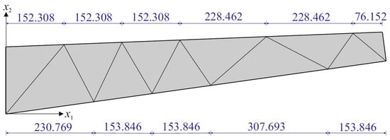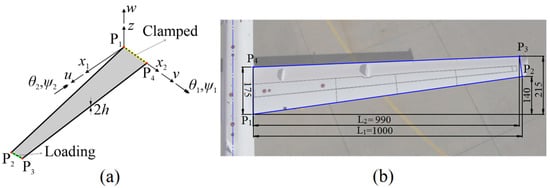 (a) Tapered wing-shaped sandwich plate; (b) dimensions [mm] of the plate, scaled in accordance with wing of NASA’s Ikhana vehicle [49].