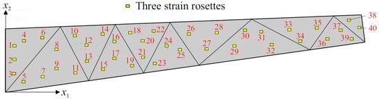 where the strain measurements with subscripts (11), (22) and (12) refer to as normal strains along and directions and shear strain in the plane, respectively. Note that, also, the superscripts ‘+’, ‘−’ and ‘j’ denote the strain rosettes located on the top, bottom, and j-th interface of the laminate, respectively.