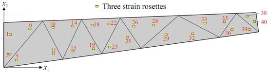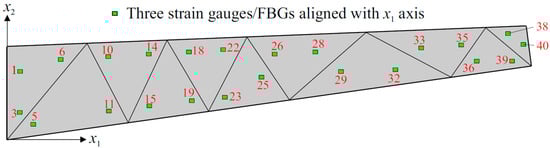 Three different sensor placement configurations, depicted in Figure 6, Figure 7 and Figure 8, are considered in the following shape sensing analysis. The exact in-plane coordinates of each strain sensor location are listed in Table 3. Regarding the through-the-thickness coordinates of these sensors, they are located at three different interfaces of the laminate: the top surface (), the bottom surface (), and the first interface among those of the bottom face sheets (). The density (total number) of strain data sampling is different for each sensor network; thus, we distinguish these configurations from each other by referring to them as “Dense (D)”, “Sparse (S)” and “Very Sparse (VS)”, respectively (Figure 6, Figure 7 and Figure 8). Triaxial strains are measured by and strain rosettes for the D and S networks, respectively, whereas uniaxial strain measurements are made by FBG sensors for the VS network. Therefore, the total number of strain data sampling for the D, S and VS sensor placement configurations count as , , and , respectively. Thanks to triaxial strain measurements, experimental section strains at each specific in situ location can be computed independently from the direction (orientation) of the sensors for both D and S configurations. However, the alignment of sensors plays an important role for the VS configuration, since the uniaxial strain measurements allow us to compute only one experimental section strain, which is along the FBG sensor direction. For each sensor placement configuration, the smoothing element analysis is employed, utilizing a smoothing domain, composed of eleven triangular elements whose dimensions are clearly shown in Figure 9. In this regard, discretely measured surface strains are computed as C1-continuous polynomial functions of in-plane axes, . Therefore, the iFEM analysis, corresponding to each sensor placement model, can be performed using any fine i3-RZT mesh. Although it is not a limitation, for simplicity, we chose to use the high-fidelity discretization, depicted in Figure 5 as the fine i3-RZT mesh, in the following iFEM-RZT analysis.
