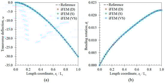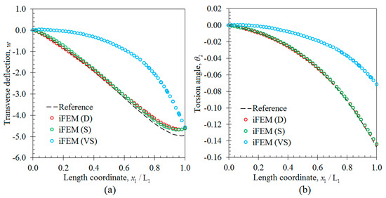 In the second case study, the iFEM analysis was carried out using i3-RZT models, which contained the discrete strain measurements obtained from the torsion scenario. The variations of transverse deflection () and the torsion angle () on the edge (P1–P2) are plotted in Figure 13. These results clearly illustrate that both i3-RZT models corresponding to D and S sensor placement configurations can attain accurate deflection results that underestimate their maximum reference values by less than 5%. Also, they can predict torsion rotations almost as same as those of FEM analysis. However, the VS configuration that contains only uniaxial strain measurements could not produce precise enough results for both and torsion variables. In fact, due to the lack of experimental shear strain measurements, this model aims to predict a bending response rather than a torsion response. This fact is clearly depicted in Figure 14 by plotting the variations of transverse deflection, , on the edge, P3–P4. This deflection should be positive for the torsion scenario, although the i3-RZT model corresponding to VS configuration predicts negative (erroneous) deflections. Nevertheless, both D and S configurations produced highly accurate and positive deflections, that correlated very well with the reference solution of torsion scenario, as depicted in Figure 14. In addition, the in-plane displacements, and , produced by both D and S models, exhibited a highly zigzagged distribution through the thickness coordinate, which are well in agreement with their reference solutions, as presented in Figure 15. In contrast, the VS model produced an inaccurate evaluation of the displacements, compared to the reference solution in Figure 15b, although it predicts a sufficiently accurate displacement in Figure 15a. Therefore, only a dense or sparse distribution of sensors that measures triaxial strains at each particular in situ location, can perform a true reconstruction of the three-dimensional deformed shapes. For example, the deformed shape, obtained using the S sensor placement configuration, is virtually indistinguishable from those of the reference deformed shape in Figure 16. Hence, it is confirmed that a sparse deployment of strain rosettes is sufficient to use in the iFEM-RZT analysis for performing a highly accurate shape sensing of torsional displacements.