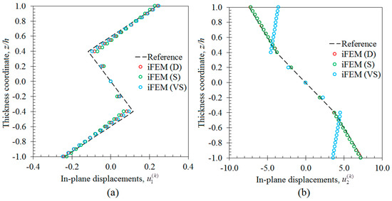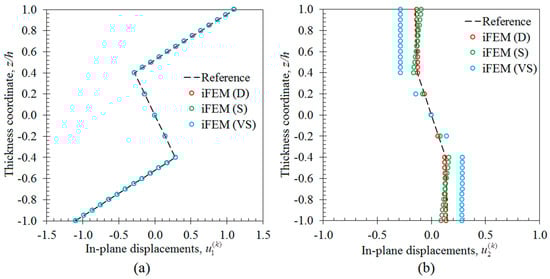 According to RZT [42], the zigzag functions at the bottom and top plate surfaces vanish identically; thus, interfacial displacements at these bounding surfaces can be calculated, in accordance with the Equation (5a) as: