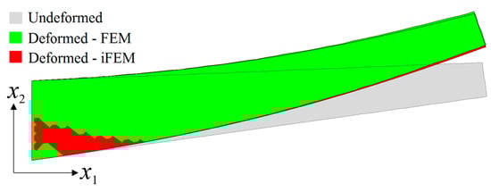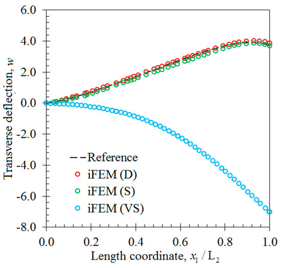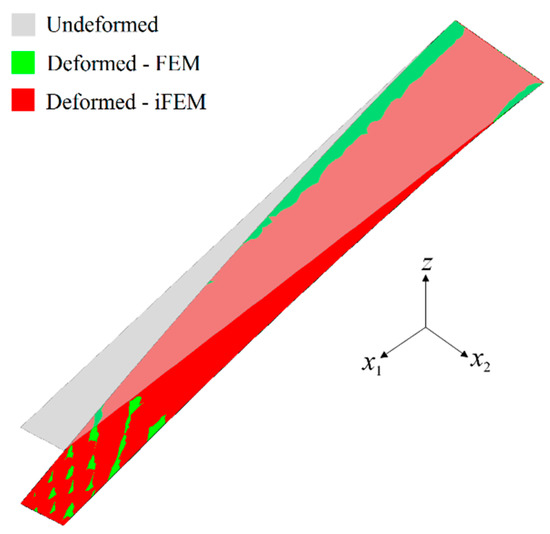 In the first case study, the iFEM analysis was performed by using the discrete strain data obtained from the bending scenario. The transverse deflection and bending rotation variations obtained from the iFEM analysis were compared with those of reference high-fidelity FEM analysis, as depicted in Figure 10, respectively. These results demonstrate that all three sensor placement configurations enable the prediction of accurate bending responses of the sandwich plate. In addition, the through-the-thickness variation of the interfacial displacements, and , at point P2, are plotted in Figure 11. These variations show that all three models produce a zigzag interfacial displacement of that is indistinguishable from their reference values. On the other hand, although the i3-RZT model, corresponding to the VS configuration, predicts erroneous displacements, they will not affect the computation of the three-dimensional deformed shape, as their maximum values are one order of magnitude lower than those of displacements. As depicted in Figure 12, the deformed shape of the sandwich laminate, predicted using the i3-RZT model of VS configuration, has a perfect match with the one produced by the FEM analysis. Remarkably, iFEM-RZT methodology can estimate a highly accurate deformed shape for the bending scenario, even if the model containing the sparsest strain measurements is used in the analysis. Hence, only a very sparse longitudinal strain data is sufficient for predicting accurate full-field bending deformations, including a true zigzag representation of interfacial displacements.