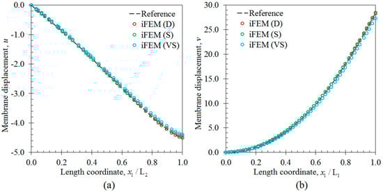 Note that it is necessary to compute the analytic counterpart of in situ section strains at exactly the same j-th interface. In contrast to experimental in-plane section strains, experimental counterparts of and (i.e., the in situ first and second transverse-shear strains and ) cannot be directly calculated using surface strain readings . Kefal et al. [43] established a computational procedure to predict these in situ strain measures, by using smoothing element analysis (SEA) [47,48] and governing (equilibrium) equations of RZT. This computational tool can be useful for treating problems exhibiting larger transverse-shear strains, such as thick composite plates/shells. For thin composite plates/shells, nevertheless, the in-plane strain components contribute to the deformation much more than transverse-shear strain components. Thus, the and contributions can be safely neglected during an iFEM analysis of thin shells.