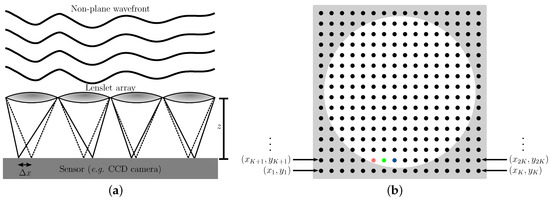 The optomechanical part of a Shack–Hartmann wavefront sensor consists of a lenslet array and a light-sensing device (usually a charge-coupled device (CCD) or complementary metal-oxide-semiconductor (CMOS) camera). When a light wavefront hits the lenslet array (see Figure 1a), it generates a grid of small light spots (aka the spotfield, see Figure 1b) that are recorded by the light-sensing device. Through the intensity and shape of each light spot, the position of each center of mass can be found. In addition, if the wavefront is not plane, the produced spots deviate from the vertical position a distance Δ x (see Figure 1a). Therefore, the wavefront slopes, d w / d x and d w / d y , can be evaluated through the distance between the lenslets and the sensor device, z (see Figure 1a), and Δ x . These slopes constitute the information used to determine the shape of the wavefront through a reconstruction algorithm [2].