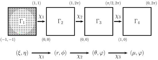 Figure 2. The mappings to transform the coordinates from the original Cartesian set Γ 1 = ( ξ , η ) | ξ 2 + η 2 < 1 to the target set Γ 3 = ( μ , φ ) | 1 > μ > 0 & 0 < φ < 2 π .