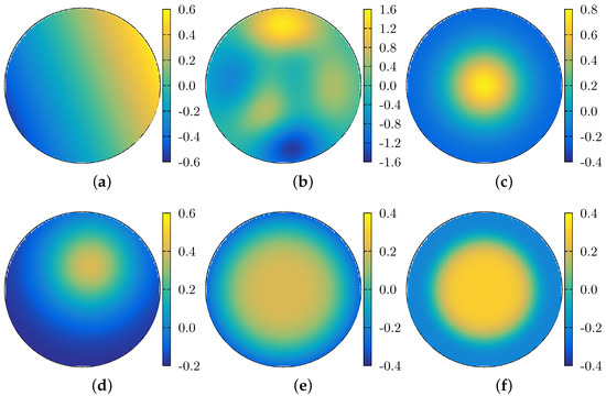 Figure 4. Topview of the wavefronts used to measure the reconstruction algorithm’s accuracy. The functions depicted are as follows. (a) a tilted plane, both around the x- and y-axis; (b) the function f 1 (see Equation (27)); (c) a centered Gaussian; (d) and off-centered Gaussian; (e) a centered super-Gaussian of order 4; and (f) a centered super-Gaussian of order 6.
