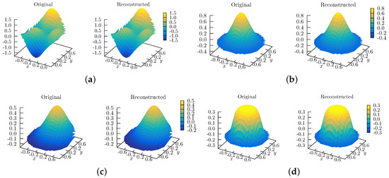 Figure 5. Qualitative reconstruction of several wavefronts, using Half Circular Harmonics, with J = 81 . The functions depicted are: (a) the test function f 1 (see Equation (27), and Figure 4b for the top view); (b) a centered Gaussian (see Figure 4c); (c) an off-centered Gaussian (see Figure 4d); and (d) a centered super-Gaussian of order 6 (see Figure 4f).