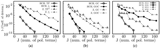 Figure 6. Compared accuracy (1-(Coefficient of determination)) vs. J (number of polynomial terms) between Half Circular Harmonics (HCH) and the Zernike (Z])polynomials, for the test functions (a) Tilted Plane (TP/TP*), f 1 , (b) a centered Gaussian (GC), an off-centered Gaussian (GOC), and (c) super-Gaussians of order 4 (SG4) and 6 (SG6).