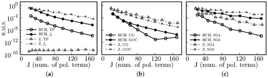 Figure 7. Compared Root Mean Square (R.M.S.) vs. J (number of polynomial terms) between Half Circular Harmonics (HCH) and the Zernike (Z) polynomials, for the test functions (a) Tilted Plane (TP), f 1 , (b) a centered Gaussian (GC), an off-centered Gaussian (GOC), and (c) super-Gaussians of order 4 (SG4) and 6 (SG6).
