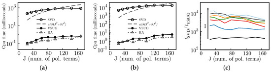 Figure 8. Processing times (CPU times) for different grid sizes (I), number of polynomial terms (J), and matrix operations. SVD is Singular Value Decomposition, VSUG represents the product V S 1 U T G (Equation (10)), and RA the product RA (Equation (11)). (a) matrix operations for a system with I = 648 ; (b) matrix operations for a system with I = 2724 ; (c) the ratio between SVD and VSGU CPU times, t SVD / t VSGU ; the arrow indicates increasing I, and I takes the values I = 276 , 648 , 1184 , 1876 , 2724 , 3720 , and 4872. In (a,c), a ( 8 I J 2 + 8 J 3 ) is the theoretical flops times a scaling constant a.