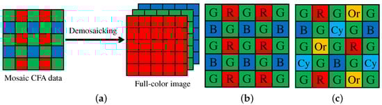(a) Color image demosaicking process; (b) Bayer CFA []; (c) five-band MSFA [].