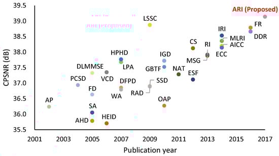 The most widely used CFA is the Bayer CFA [] (Figure 1b), for which numerous demosaicking algorithms have been proposed [,,,]. Figure 2 shows the color peak signal-to-noise ratio (CPSNR) performance of representative algorithms on a standard color image dataset []. The CPSNR performance has continuously been improved, suggesting the ongoing demand for more highly accurate demosaicking algorithms.