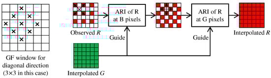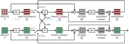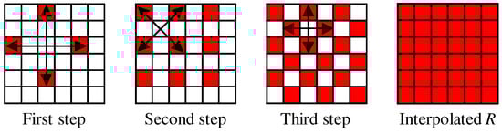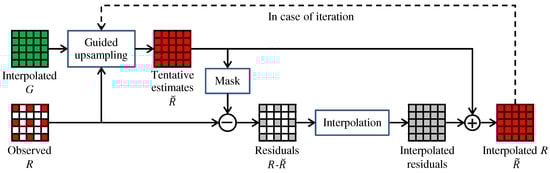 Figure 3 outlines the RI framework. Here, we assume that the G band interpolation is already completed and take the R band interpolation as an example to explain the framework. The RI framework consists of four steps. (i) Tentative estimates of the R band (denoted as ) are generated from the interpolated G band by guided upsampling of the observed R values. (ii) Residuals (denoted as R-) are calculated by taking the differences between the tentative estimates and the observed R values. (iii) The residuals are interpolated. (iv) The tentative estimates are added to the interpolated residuals to obtain the interpolated R band (denoted as ). The key effect of the RI framework is that the residuals become smoother than the conventional color differences (i.e., R-G) by effectively generating the tentative estimates [,]. This property increases the interpolation accuracy. A similar procedure can be applied for the G band interpolation, as will be detailed in Section 4. In the following, we explain three RI-based algorithms, which are different regarding tentative estimates generation.