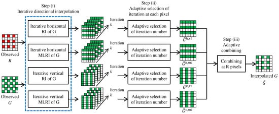 Step (i): Iterative directional interpolation. In this step, RI and MLRI are applied for iterative directional interpolation. Figure 5 illustrates the flow of the G interpolation at the R lines in the horizontal direction. The G interpolation in the vertical direction is performed in the same manner.