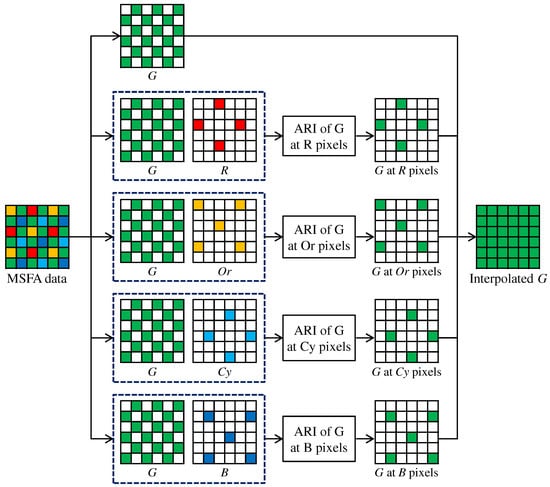 In this section, we extend our proposed ARI for multispectral image demosaicking with the five-band MSFA of Figure 1c. Our proposed multispectral demosaicking algorithm using ARI first interpolates the G band, which is the most densely sampled in the five-band MSFA. Then, the other four bands are interpolated using the G band as a guide.