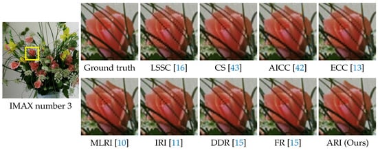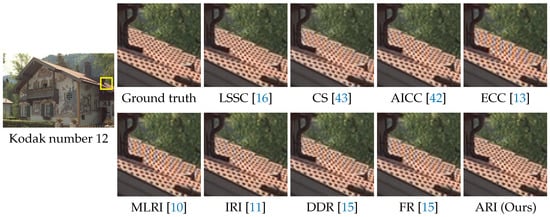 For the Kodak dataset, the algorithm based on dictionary learning, i.e., LSSC [], offers the best performance. The interpolation-based algorithm with multiscale gradients, i.e., MSG [], follows LSSC. For the average of all images for both datasets, our proposed ARI improves IRI by approximately 0.6 dB in CPSNR and outperforms all existing algorithms, including state-of-the-art algorithms based on training images, such as LSSC and FR. Let us note that FR uses MLRI as a source of initial interpolation to learn efficient regressors. Therefore, the integration of our proposed ARI into FR has the potential to further improve the performance. Table 2 summarizes the average structural similarity (SSIM) [] performance, which demonstrates results similar to those of the PSNR performance in Table 1.