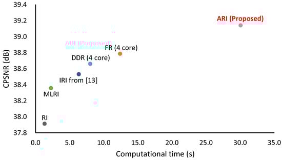 Our proposed ARI (Code available at http://www.ok.sc.e.titech.ac.jp/res/DM/RI.html.) was compared extensively with 29 algorithms that were briefly reviewed in Section 2. The source codes are publicly available or executable at their authors’ websites. Only for IRI [,], we asked the authors to send us the resulting images, because the source code is not publicly available. We used a default set of parameters provided by the authors for the evaluation. DDR [] and FR [] have two sets of parameters, in which each set is optimized for each dataset. To evaluate all algorithms under a common parameter condition in both datasets, we selected a better set of parameters for DDR and FR in terms of the average CPSNR performance on both datasets. We also included the previous version of ARI (denoted as ARI (Previous)) [] as a reference. We omit ten border pixels from the evaluation to discount implementation errors in those pixels.