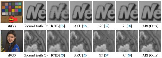 We next consider the task of multispectral image demosaicking. The CFA and demosaicking technologies are extensible for multispectral imaging with a single image sensor []. The only modification required in hardware is to replace the CFA with a multispectral filter array (MSFA), in which more than three spectral bands are arrayed. Figure 1c shows a representative five-band MSFA, consisting of typical RGB bands and additional orange and cyan bands (denoted as Or and Cy bands, respectively) in the visible spectrum []. The multispectral extension of the CFA has attracted increasing attention because of its potential for compact and low-cost multispectral image acquisition. However, the demosaicking process for an MSFA poses a challenging problem owing to the very sparse sampling of each spectral band in the MSFA. To address this challenge, we extend our proposed ARI for multispectral image demosaicking, considering the five-band MSFA of Figure 1c. Experimental comparisons using several multispectral image datasets demonstrate that ARI can achieve state-of-the-art performance also for the task of multispectral image demosaicking.