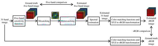 Figure 13 shows the flow of experimental comparison using the 31-band datasets. As shown in the bottom row of Figure 13, ground truth sRGB images were simulated from the 31-band images based on the XYZ color matching functions and the XYZ-to-sRGB transformation matrix with a correct white point. As shown in the top row of Figure 13, ground truth five-band images were simulated from the 31-band images using the spectral sensitivity of the five-band MSFA as described in []. To generate the five-band images, we used the CIE D65 illumination for the CAVE and the TokyoTech datasets. For the NUS dataset, we used given illumination spectrum for each scene. Then, the ground truth five-band images were mosaicked according to the five-band MSFA of Figure 1c and demosaicked using compared demosaicking algorithms. Finally, the demosaicked five-band images were converted to sRGB images using a linear model-based spectral reflectance (31-band image) estimation [] and a rendering process from the spectrum to the sRGB with the XYZ color matching functions. The ground truth and the estimated images were compared in the five-band and the sRGB domains. Our proposed ARI was compared with three existing algorithms, BTES [], GF [] and RI []. We evaluated the PSNR performance of the five-band images and PSNR, CPSNR, DeltaE (Euclidean distance in the CIE Lab space) and CIEDE2000 performance of the sRGB images.