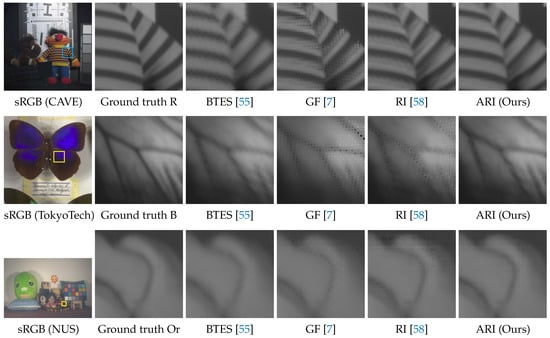 The second comparison was performed on three 31-band multispectral image datasets, the CAVE [], the TokyoTech [] and the NUS [] datasets. The CAVE and the TokyoTech datasets were captured using a monochrome camera with a liquid crystal tunable filter []. The NUS dataset was captured using a Specim’s hyperspectral camera (http://www.specim.fi/products/pfd-65-v10e/). The CAVE dataset contains 32 scenes of size 512 × 512 pixels. The TokyoTech dataset contains 30 scenes of size 500 × 500 pixels. The NUS dataset contains 66 scenes (training 41 scenes and testing 25 scenes for the purpose of []) of different pixel resolutions. In the NUS dataset, we used the testing 25 scenes for evaluation.