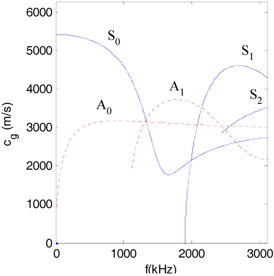 Figure 1 plots the dispersive curves of the group velocity of Lamb waves for a given structure (half-depth h = 0.75 mm). It can be seen from Figure 1 that for a given structure, the group velocities of different modes at a certain frequency are different, which means that the ultrasonic energy that is transported by different modes of Lamb waves is asynchronous. Therefore, in order to obtain a strong effect of ultrasound energy diffusion, the modes of Lamb waves should be chosen carefully.