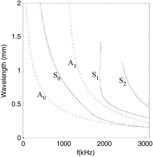 In addition, for the purpose of easily separating the diffusive and dissipative components of the ultrasonic signals, the wavelengths of all of the modes of Lamb waves should be less than the maximum size of all the damages. Figure 2 plots the wavelength of Lamb waves for a given structure (half-depth h = 0.75 mm).