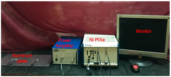 To investigate the characteristics of the ultrasound energy diffusion of Lamb waves, an experimental setup is designed and fabricated, as shown in Figure 3. The experimental setup mainly consists of an aluminum plate (Alloy 5052) bonded with two PZT disks (shown in Figure 4), an amplifier with a bandwidth of 0–3.0 MHz and a fixed gain of 50 (Trek Model 2100H) for a piezoceramic load, a signal generation, a data acquisition system (a Ni PXIe-1082 chassis with a Ni PXI-5412 arbitrary waveform generator and a Ni PXIe-5105 digitizer), and a monitor.