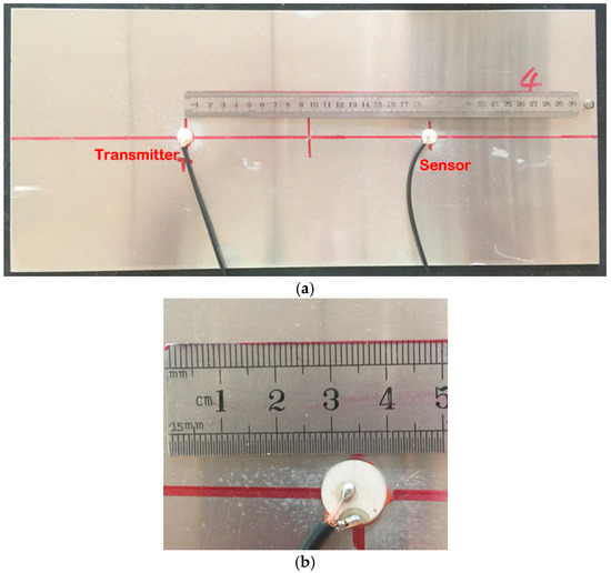 An aluminum plate with PZT (lead zirconate titanate) disks: (a) an aluminum plate (Alloy 5052) with a PZT transmitter and a PZT sensor; (b) a PZT on the aluminum plate.