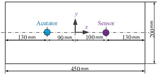 Since the ultrasound energy diffusion coefficient and the ultrasound energy dissipation coefficient are not influenced by the locations of the actuator and the sensor nor the dimension of the plate, an aluminum plate with a dimension of 450 mm × 200 mm × 1.5 mm is selected, and as shown in Figure 5, two PZT disks are bonded on the plate by epoxy at two fixed locations. The size of the PZT disk is Φ12 mm × 1 mm, and the locations of these two PZTs are also shown in Figure 6. During the experiments, one of the two PZTs is chosen as an actuator, and the other is used as a sensor.