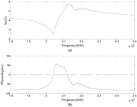 Impedance of the bonded PZT disk: (a) magnitude of the impedance; (b) phase angle of the impedance.