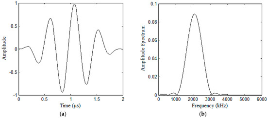 Excitation pulse in the time and frequency domains: (a) time domain; (b) frequency domain.