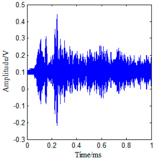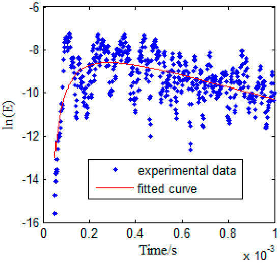 Figure 8 shows the measured temporal signal with environmental noise. The parameters for signal processing described in Section 2 are selected as Δt = 16.67 μs, γ = 0.9, Δf = 0.15 MHz, fc = 2.1 MHz, and the total recorded time t = 1 ms. The ultrasonic energy density is then obtained by the steps listed in Section 2. The ultrasound energy density curve under an excitation pulse with a center frequency of f = 2.1 MHz (when there is no damage) is plotted in Figure 9, and the red curve in Figure 9 is obtained by curve fitting, based on Equation (4).