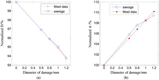 Normalized ultrasonic energy coefficients of damage D1 versus the damage size: (a) ultrasound energy diffusion coefficient; (b) ultrasonic energy dissipation coefficient.
