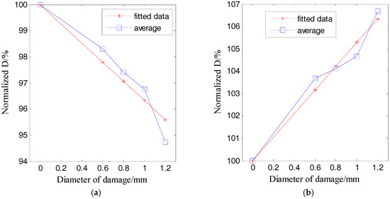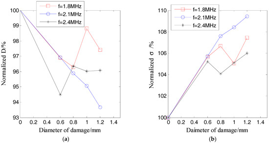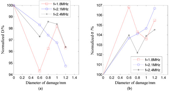 Figure 12a and Figure 13a indicate that all of the normalized ultrasound energy diffusion coefficients in the presence of damage were less than those without damage. However, the changes of the normalized ultrasound energy diffusion coefficients under excitation pulses with center frequencies of f = 1.8 MHz and f = 2.4 MHz were no longer linear to the damage size.