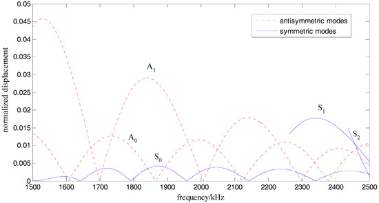 However, based on the tuned Lamb wave theory [71], when a PZT is attached to a given structure to excite Lamb waves, there are many tuned frequencies at which the displacement of one certain mode of Lamb wave is zero. Among these tuned frequencies, such frequencies where there is only one dominant mode of Lamb wave can be obtained by a numerical method.