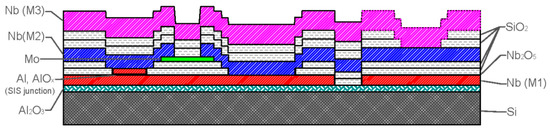Currently, the most sensitive detector for subtle magnetic field measurements is a DC SQUID magnetometer based on low-Tc superconducting polycrystalline Nb films and planar JJs. A magnetic field resolution below 1 fT/√Hz at 4.2 K has been demonstrated [16]. Thin film JJs based on Nb films are widely implemented in superconducting electronics, including low-Tc DC SQUID magnetometers. The noise and signal characteristics of such magnetometers depend directly on the quality of the JJs. High quality JJs with a small spread of parameters over the substrate and between batches are vitally important for the development of low-noise sensors that are suitable for NDE applications. Several methods for the fabrication of shunted JJs have been developed. These methods include the use of double-barrier junctions with an additional normal layer between two conventional JJs [17,18] and Nb/αSi/Nb structures with a doped Si layer [19]. However, the most widely used and best-developed method involves the use of Nb/Al-AlOx/Nb tunnel junctions [20,21] with an additional external resistive shunt made from Mo (Figure 1). The Mo shunt resistor is highlighted in green in Figure 1.